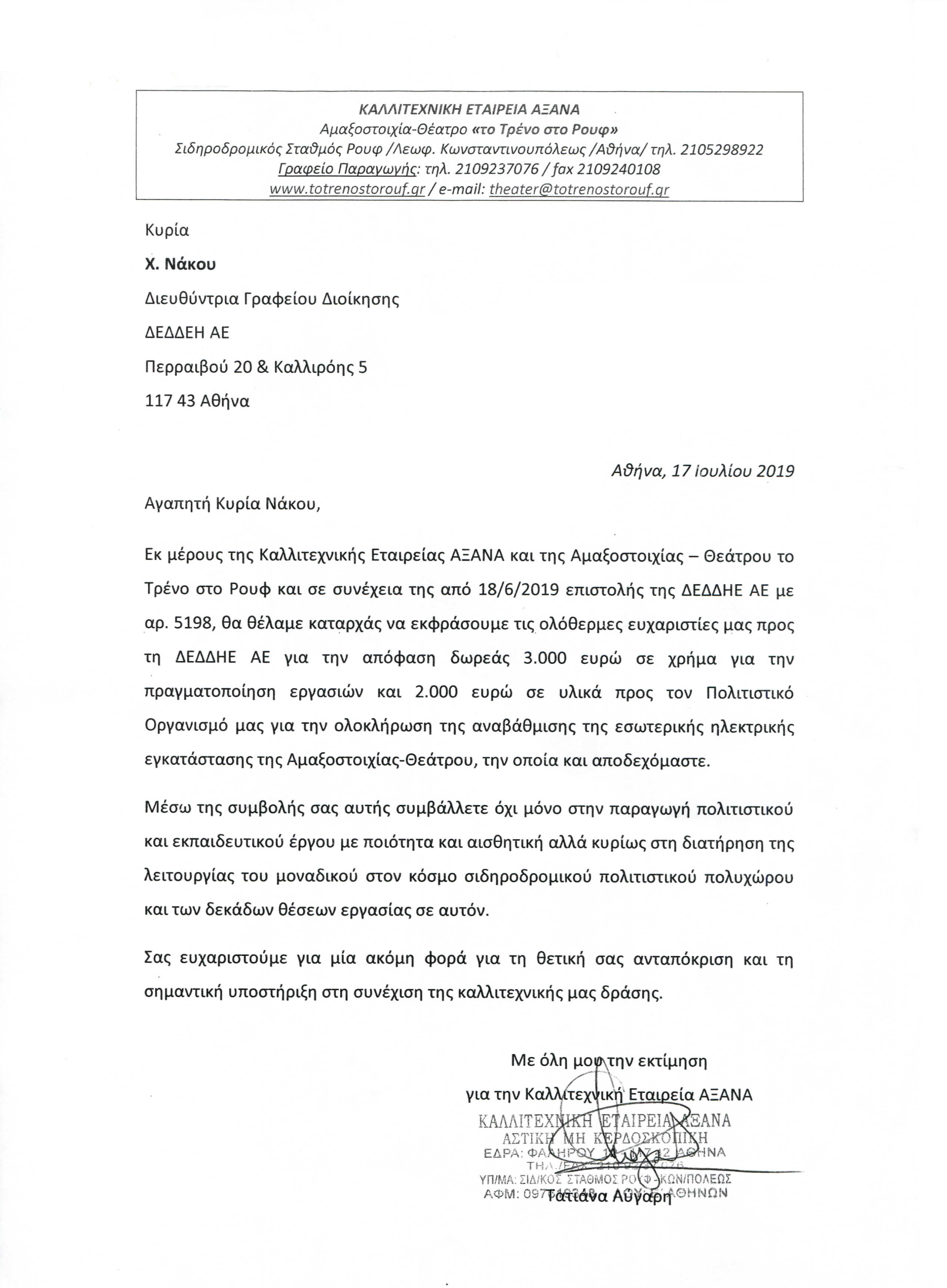 Ο ΔΕΔΔΗΕ στο πλαίσιο της εταιρικής υπευθυνότητας, προέβη στην αναβάθμιση της εσωτερικής ηλεκτρικής εγκατάστασης της Αμαξοστοιχίας – Θεάτρου «Το Τρένο στο Ρουφ», κατόπιν αιτήματος της Αστικής μη Κερδοσκοπικής Καλλιτεχνικής Εταιρίας «ΑΞΑΝΑ».